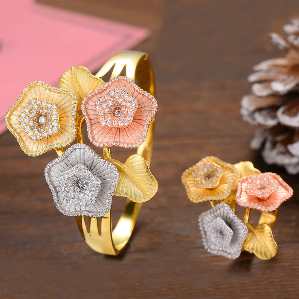 Nedorogo - LARRAURI Роскошные цветы лист роскошный полный микро кубический цирконий геометрический дизайн женский браслет кольцо комплект платье ювелир...